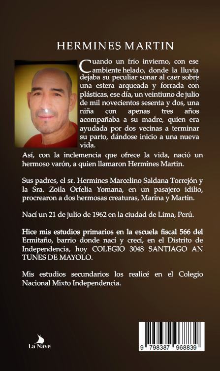 Así, con la inclemencia que ofrece la vida, nació un hermoso varón, a quien llamaron Hermines Martin. Sus padres, el sr. Hermines Marcelino Saldana Torrejón y la Sra. Zoila Orfelia Yomana, en un pasajero idilio, procrearon a dos hermosas creaturas, Marina y Martin. Nací un 21 de julio de 1962 en la ciudad de Lima, Perú. Hice mis estudios primarios en la escuela fifiscal 566 del Ermitaño, barrio donde nací y crecí, en el Distrito de Independencia, hoy COLEGIO 3048 SANTIAGO AN TUNES DE MAYOLO.